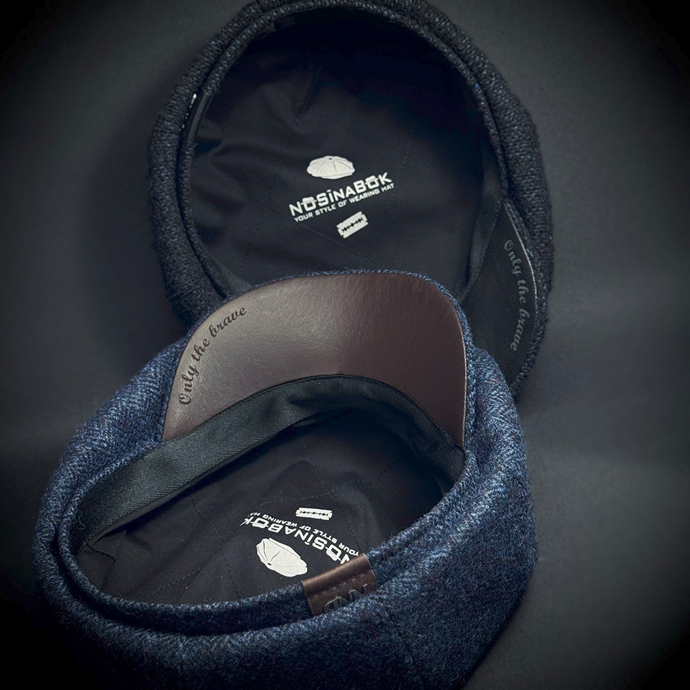На фото: восьмиклинки из твида с нижними кожаными козырьками.
