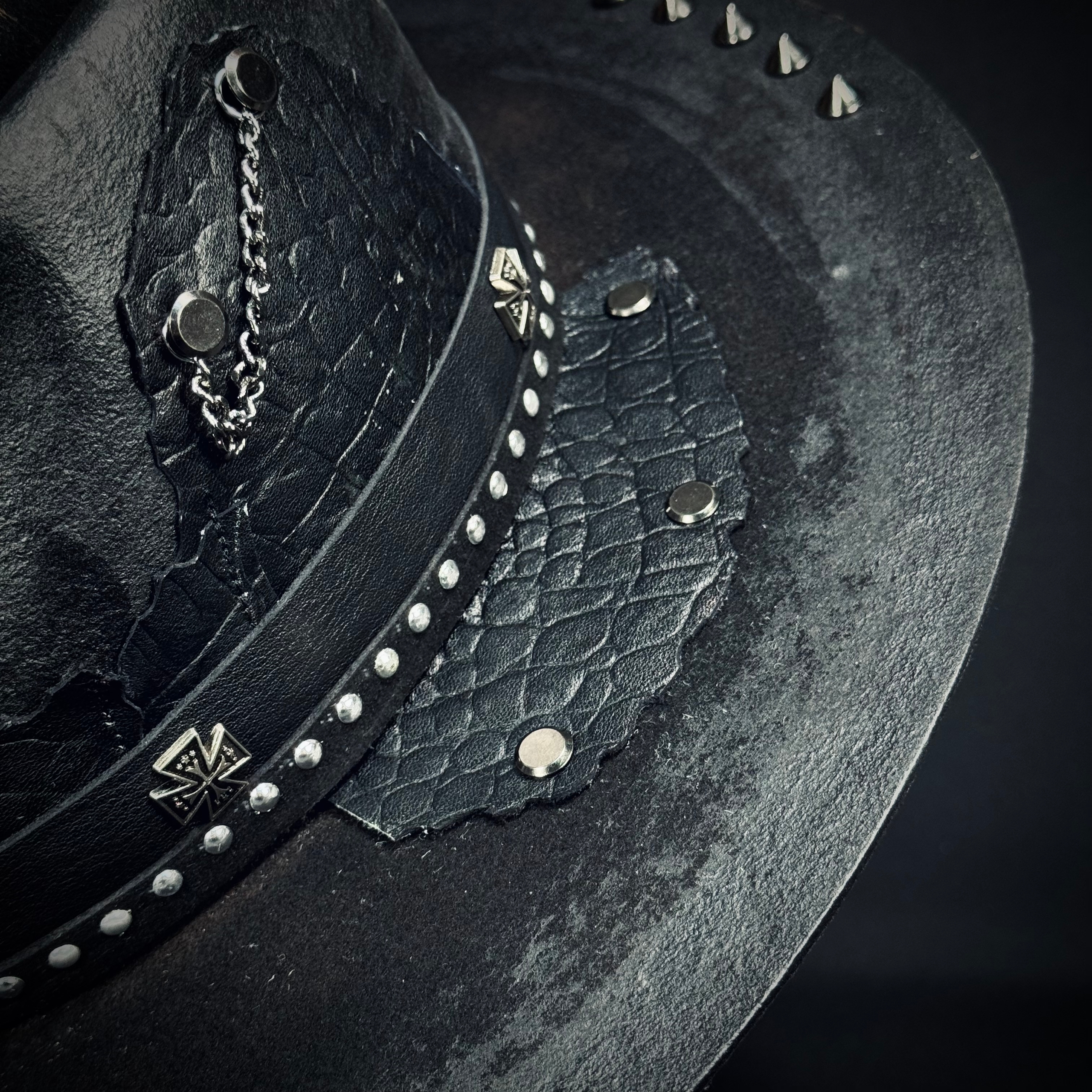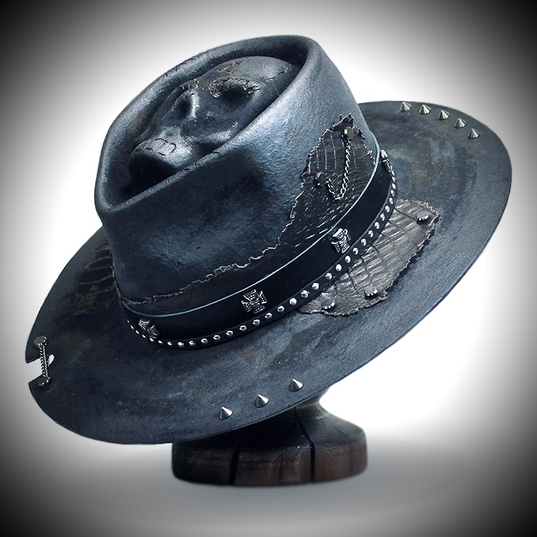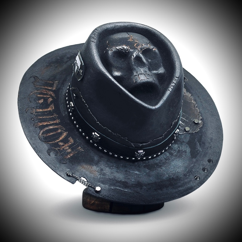 Отделка: натуральная кожа двух цветов и фактур, металлические цепи и винтовые кобурные заклепки, бритва и декоративные украшения в виде перевернутой пятиконечной звезды Надпись: выполнена в готическом стиле в технике выжигания