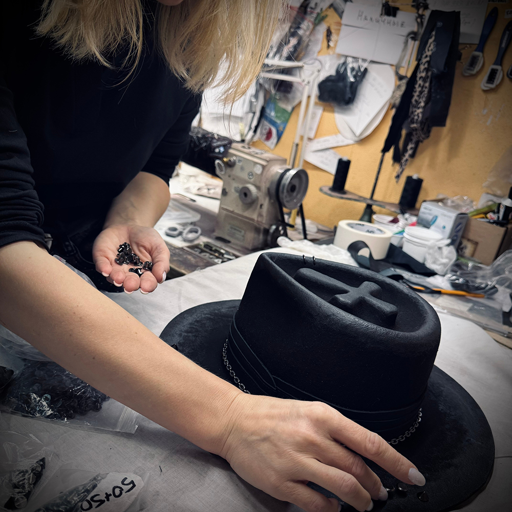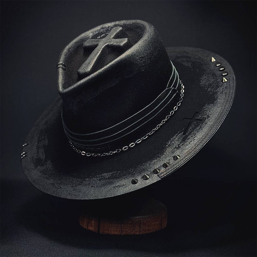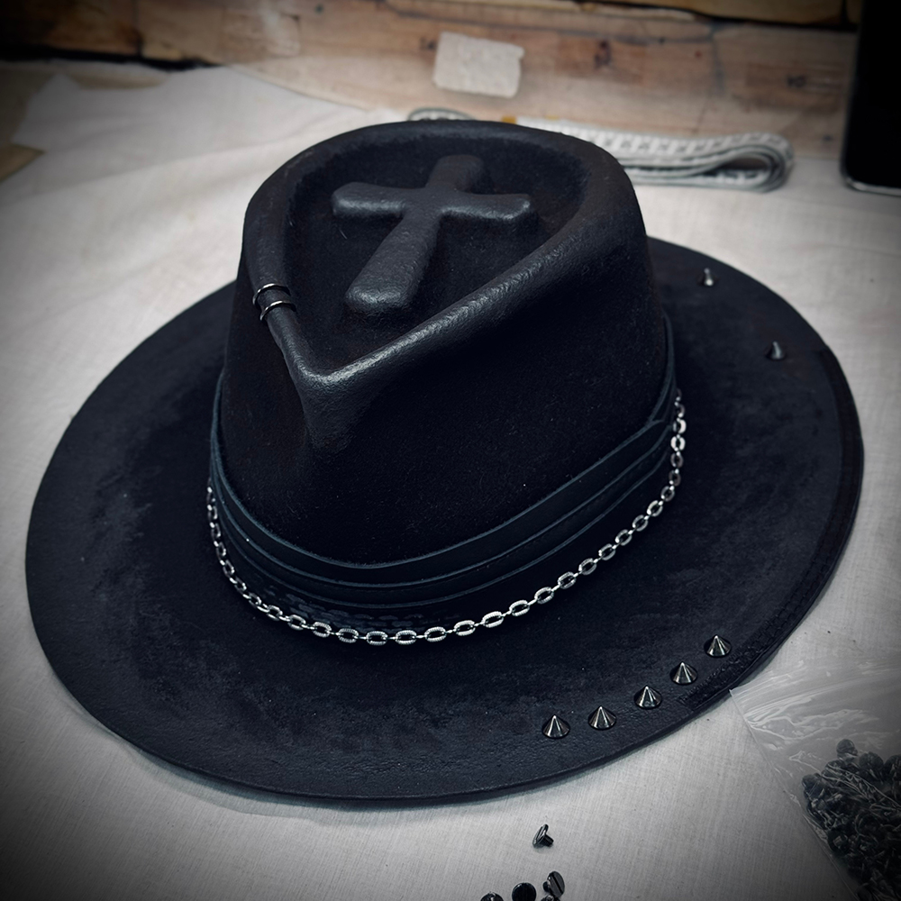 Чёрный фетр, прошедший через обжиг и вощение. Рельефный крест наверху — оттиск, вдавленный в саму поверхность. Отсюда и имя.