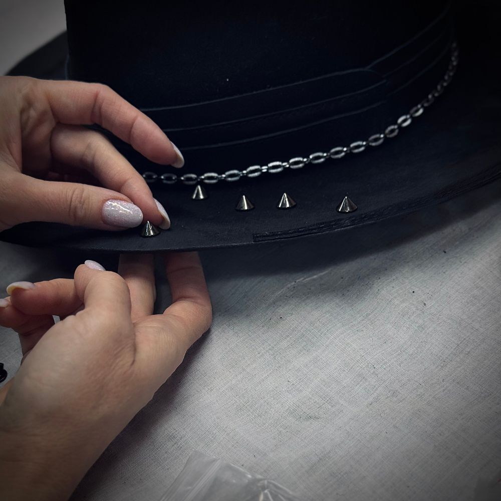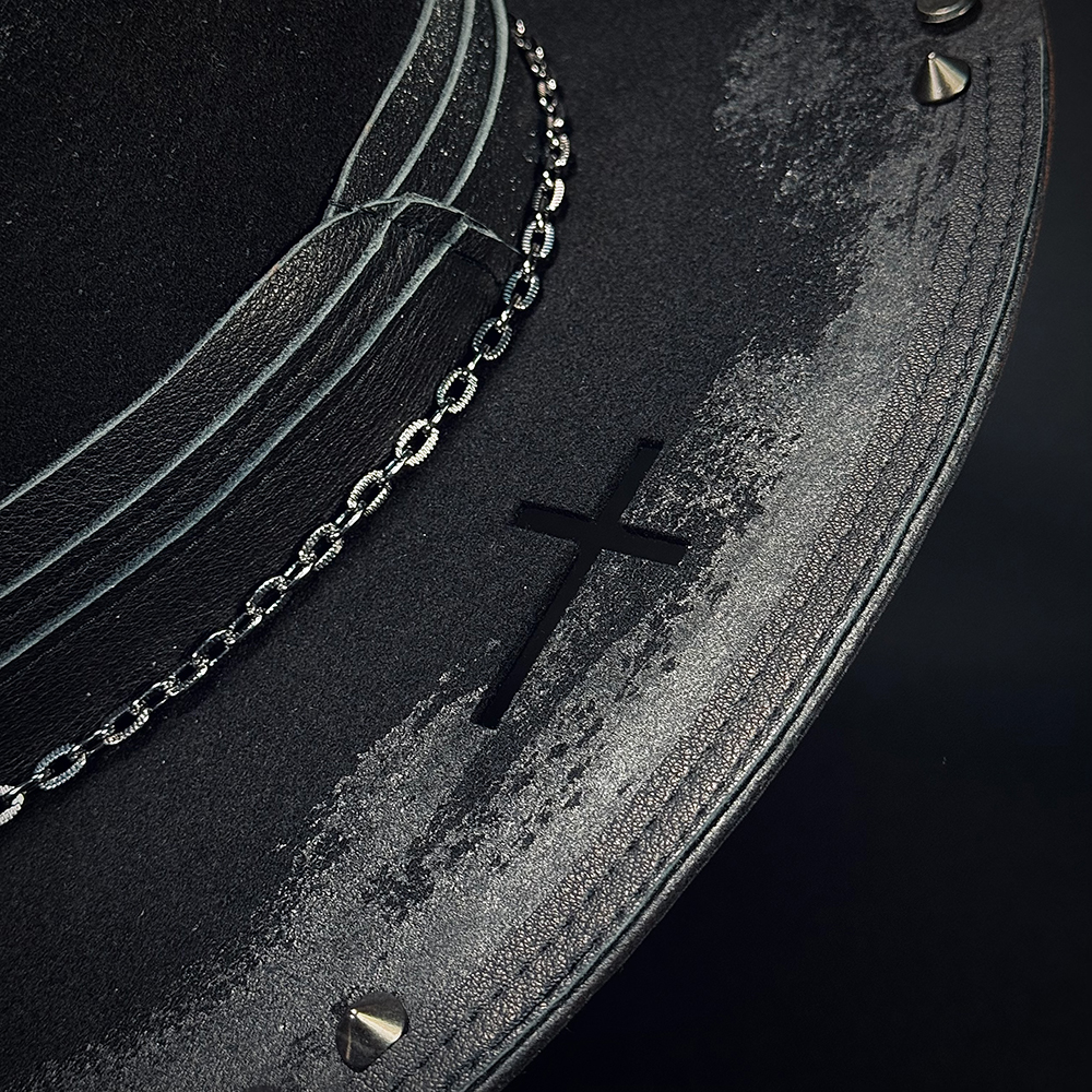 Отделка: кожаная лента, металлическая фурнитура (шипы, клёпки, цепочка, кольца), пробитый насквозь крест на поле