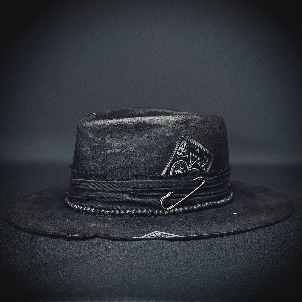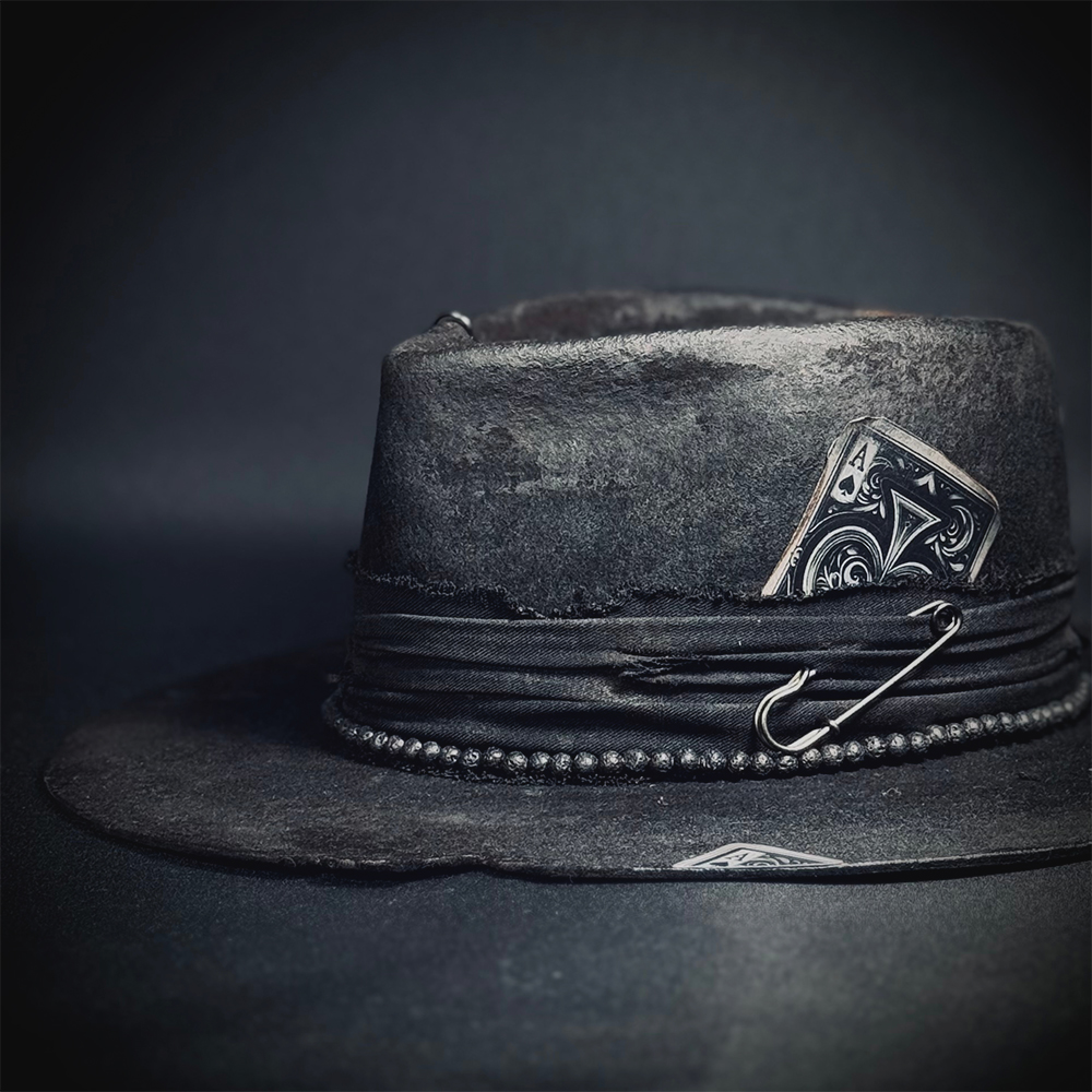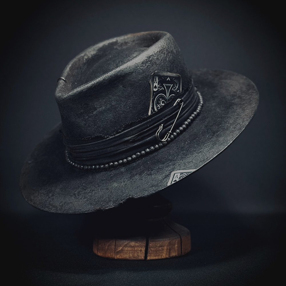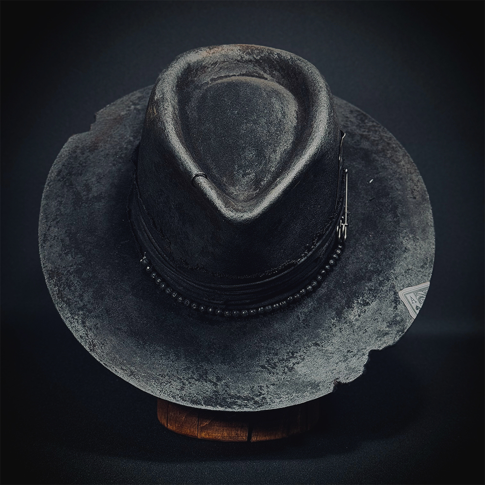 Материал: фетр, 100 %-ная шерсть Цвет: черный с обжигом и вощением Отделка: состаренная хлопковая лента, бусы из лавы, состаренная карта, металлический декор