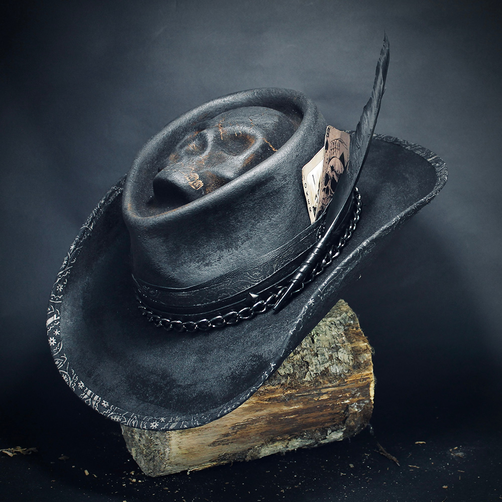 Отделка: натуральная кожа, металлические цепи и винтовые кобурные заклепки, черное перо
