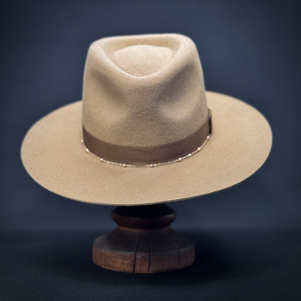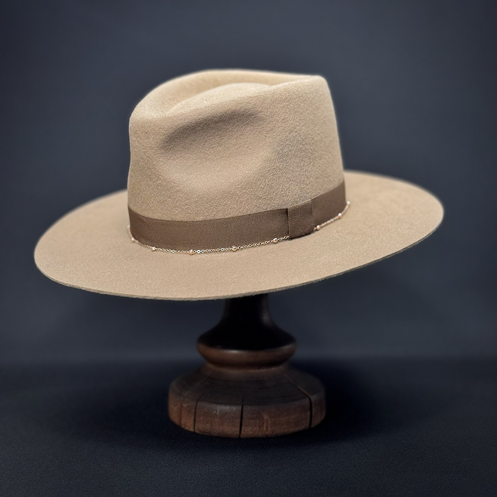 Репсовая лента в тон, плотная и элегантная. По нижнему краю ленты — тонкая цепочка с крошечными металлическими шариками золотого цвета. Цепочка слегка играет при движении, добавляя образу лёгкое сияние.